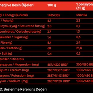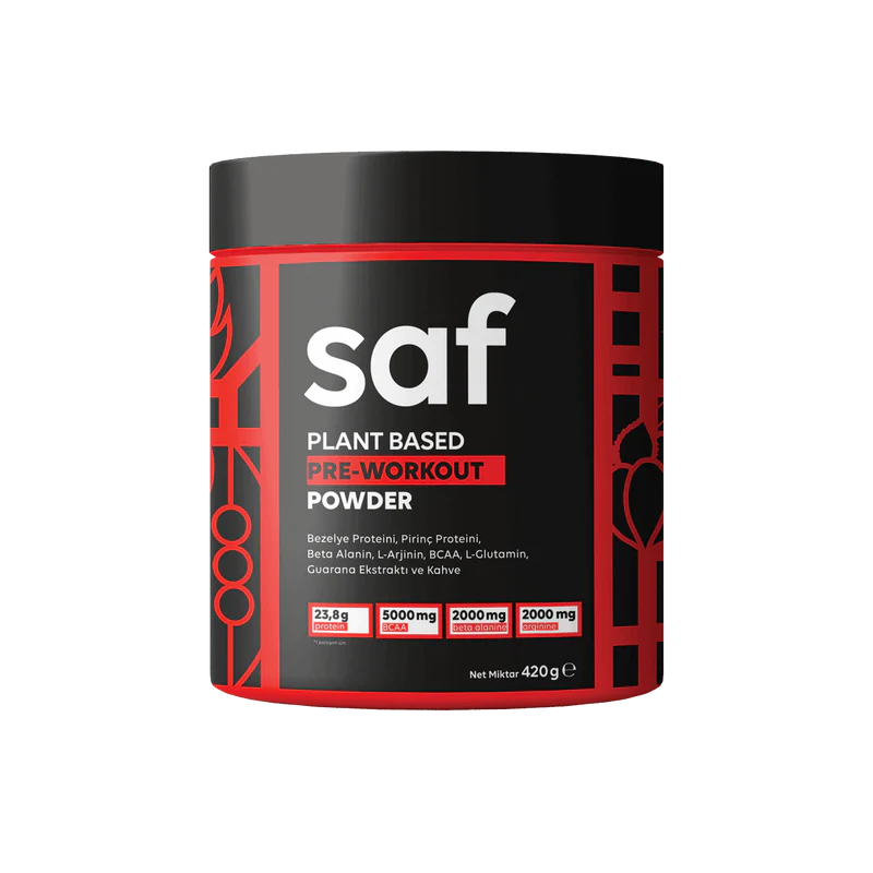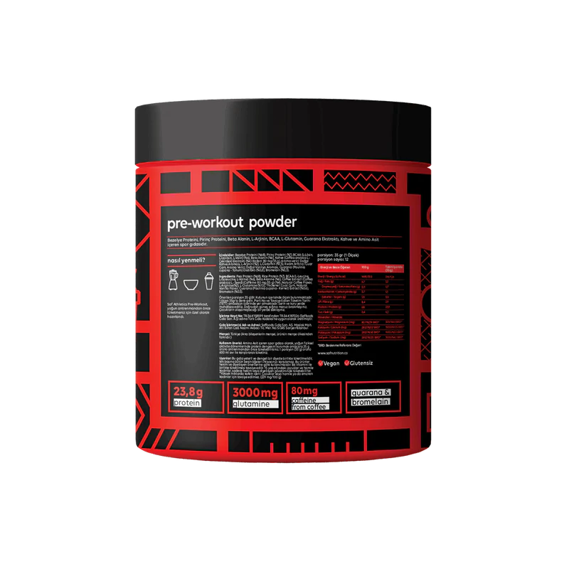 Bezelye Proteini, Pirinç Proteini, Beta Alanine, L-Arginine, BCAA, L-Glutamine, Guarana, Kahve ve Amino Asit içeren sporcu gıdası.