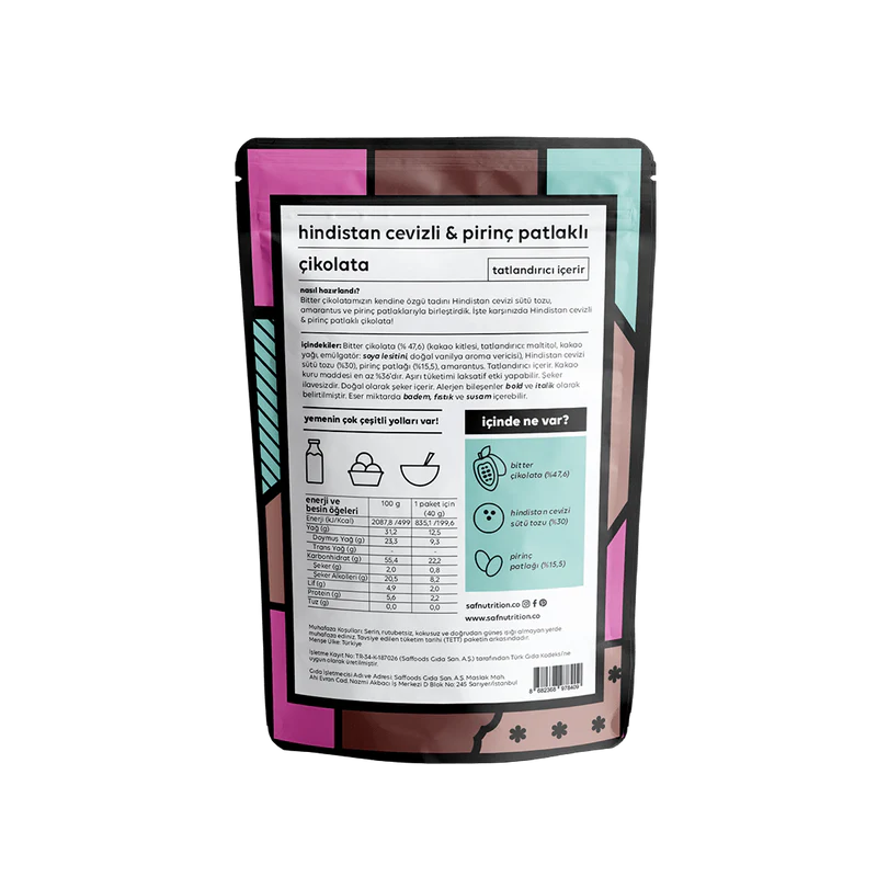 İçindekiler: Bitter çikolata (% 47.6) (kakao kitlesi, tatlandırıcı: maltitol, kakao yağı, emülgatör: soya lesitini, doğal vanilya aroma vericisi), hindistan cevizi sütü tozu (%30), pirinç patlağı (%15.5), amarantus. Tatlandırıcı içerir. Aşırı tüketimi laksatif etki yaratabilir. Şeker ilavesidir. Doğal olarak şeker içerir. Alerjen bileşenler bold ve italik olarak belirtilmiştir. Eser miktarda badem, fıstık ve susam içerebilir.