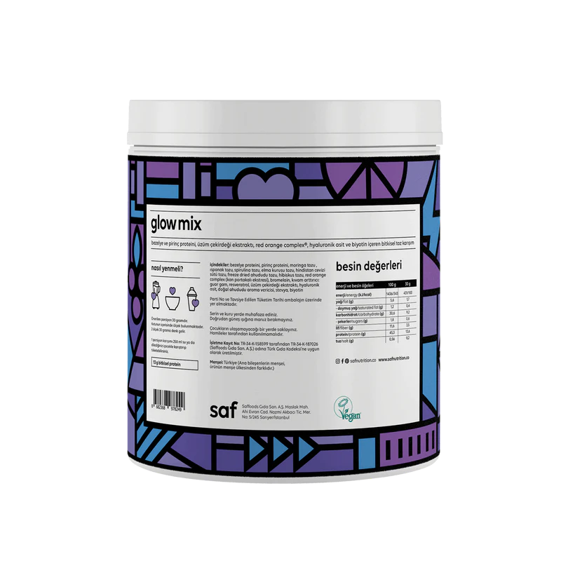 Bezelye proteini, pirinç proteini, üzüm çekirdeği ekstraktı, red orange complex, resveratrol, hyalüronik asit ve biotin içeren bitkisel protein mix’dir.